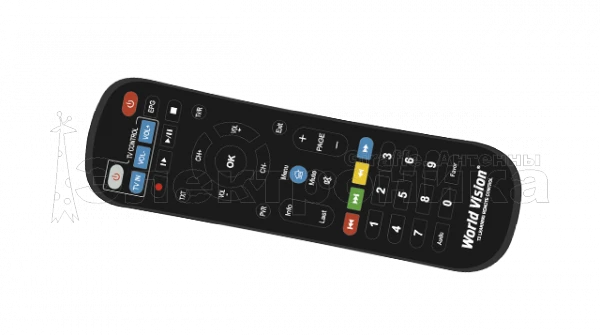 Универсальный пульт дистанционного управления имеет функцию обучения и позволяет запрограммировать 4 кнопки для управления вашим телевизором, и совместной с новыми и будущими моделями компании World Vision ™, а именно World Vision T61M, World Vision T62A, World Vision T62D, World Vision T62M, World Vision T63, World Vision T63M, World Vision T70. С замечательной эргономикой, размером, улучшенной тактильностью, широкими углами и работой на значительном расстоянии от ресивера. Обучаемый пульт World Vision. Быстрая настройка. Пульт имеет 4 программируемые кнопки для управления телевизором: TV Power, Vol+, Vol-, A/V. Одновременно нажмите кнопки ОК и 0, загорится красный светодиод. Направить пульт напротив обучаемою пульта (расстояние 2-5см). Нажмите и отпустите кнопку которую вы хотите обучить (например, кнопку TV Power) Удерживайте нажатой кнопку оригинального пульта дистанционного управления (например, кнопку ТV Роwer). Пока светодиод на обучаемом пульте мигнет 2 раза и не засветится постоянно, затем отпустите