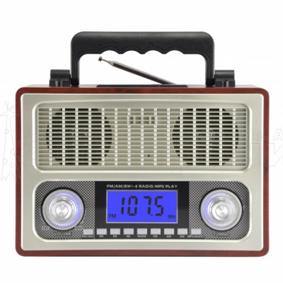 2 динамика FM: 88-108 MHz AM: 522-1720 KHz SW: 5,6-22 MHz Разъёмы: USB, TF(до 32Гб),SD(до 32Гб), AUX Питание: аккумулятор встроенный (зарядка 6V) / 220V шнур в комплекте / 4*R20 (в комплект не входят) Размер: 27 х 19 х 12 см